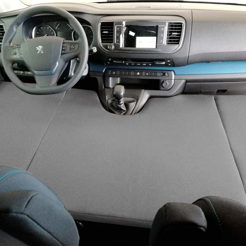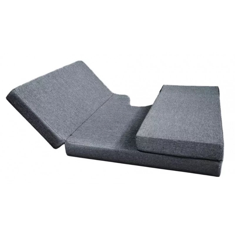 Colchón plegable para cabina de 8 cm de altura fabricado en espuma fría de 7 cm (densidad 25 kg/m3) y tablero de MDF de 1 cm con funda gris.