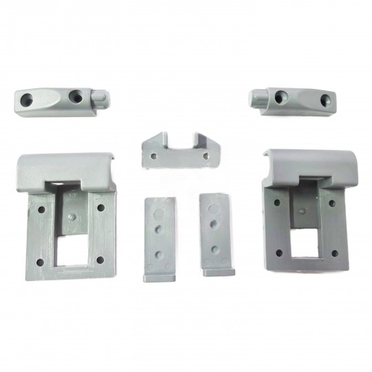 Kit completo con todos los componentes plásticos necesarios para el montaje o reparación de un sistema de mesa corre-dera. Este conjunto incluye las fijaciones para la pared, los soportes para el tablero y los bloqueadores que aseguran la mesa en su posición, todo en color gris.